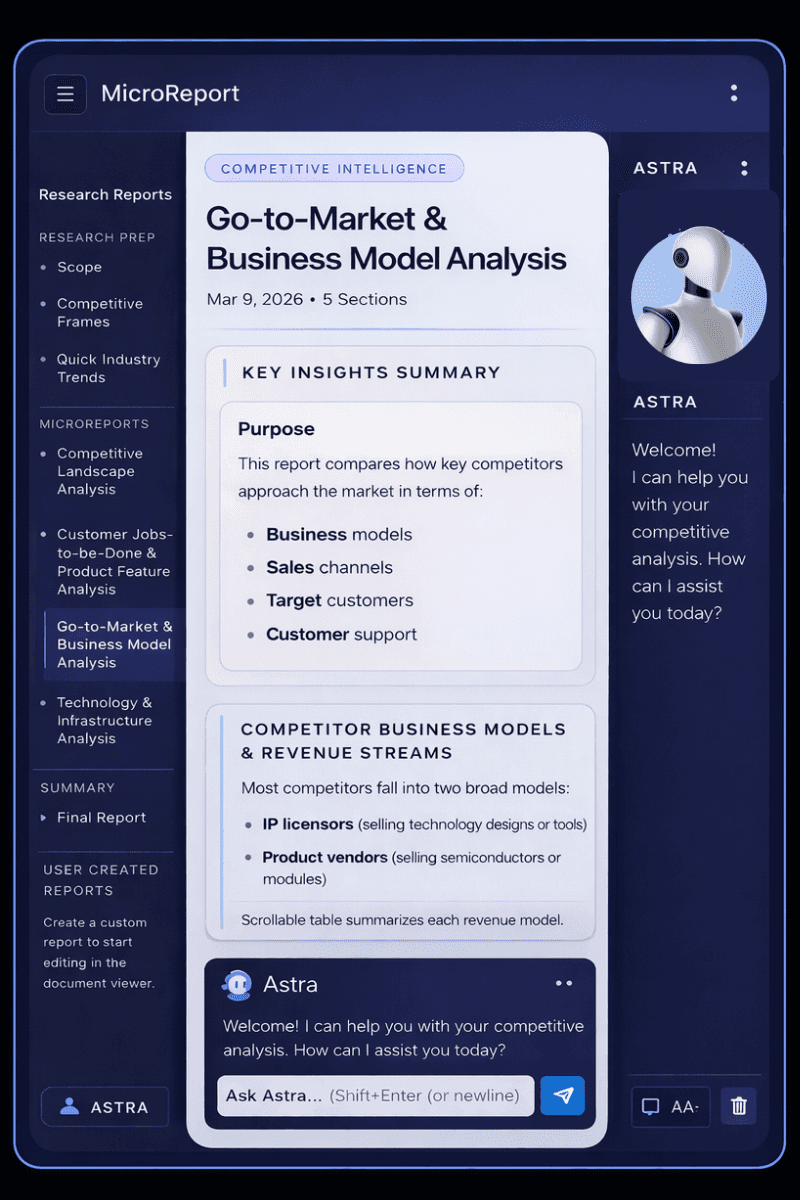 astra analyzes competitors from every angle and adapts its benchmarking to your strategic context—whether you’re entering markets, navigating regulations, or assessing mergers